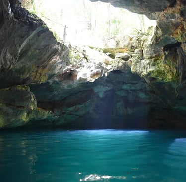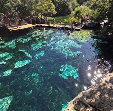Cenote Azul: A large open cenote with deep, clear blue water — ideal for swimming, cliff-jumping, and relaxing amid lush vegetation.