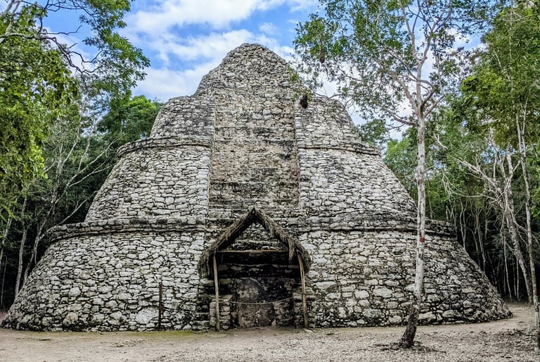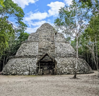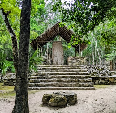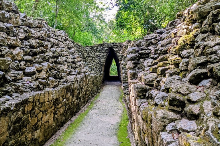 Muyil: Nestled inside the Sian Ka’an Biosphere Reserve and only about 20 minutes from Tulum, Muyil is quieter and more intimate. Its temples, woodland paths, and nearby lagoon make it a serene stop for nature lovers.